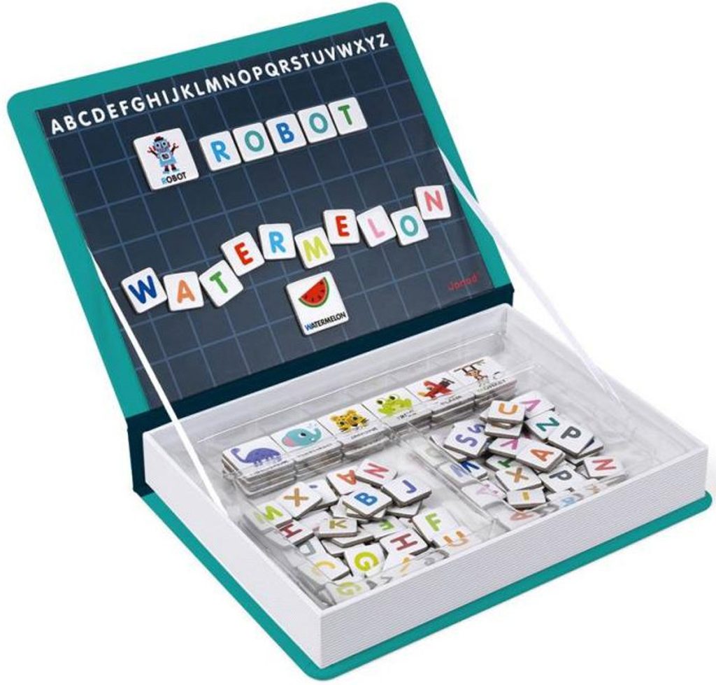 Magnetibook s anglickou abecedou. V balení je 104 magnetických písmen a 26 kartiček s předlohami. Děti z magnetek mohou skládat anglická slovíčka, díky předlohovým kartičkám s obrázku se řadu nových slovíček naučí.