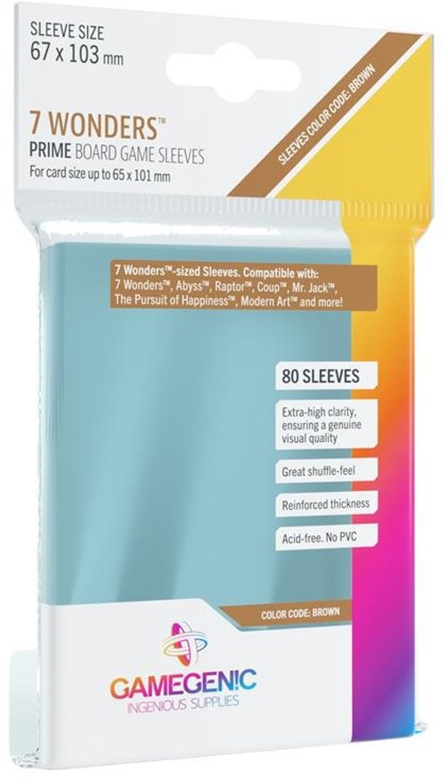 Obaly na karty o rozměrech 67 x 103 mm, tedy perfektní pro hry z rodiny 7 Divů světa (7 Wonders). V balíčku je 80 kusů obalů. Výrobcem je Gamegenic.