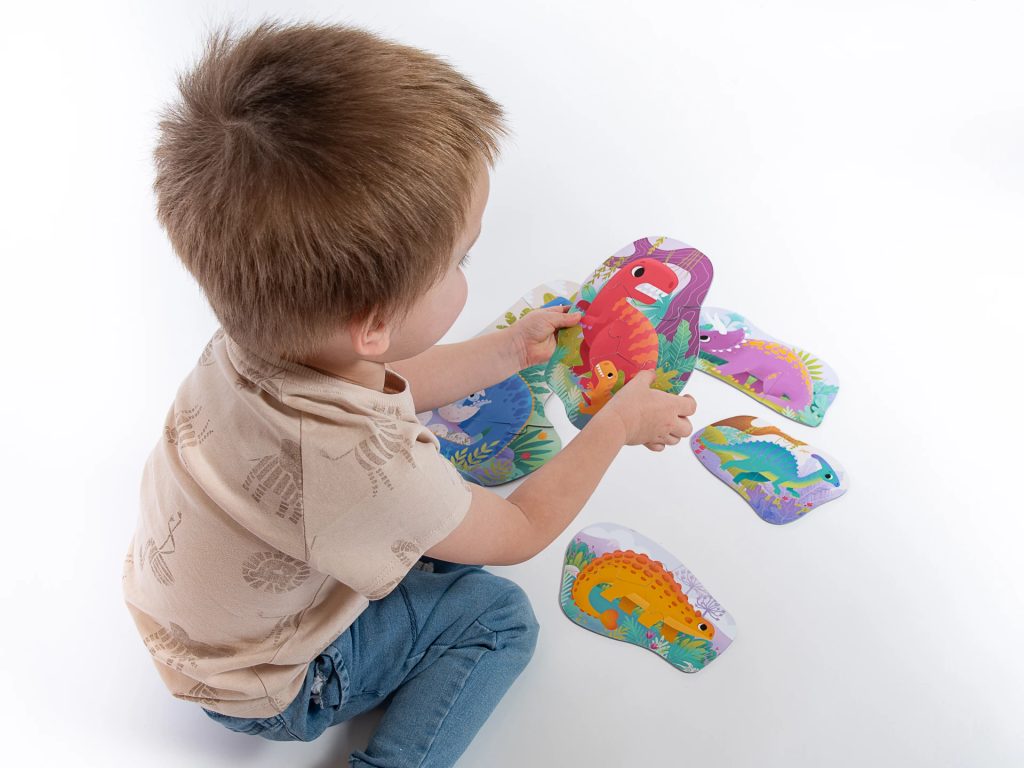 I nejmenší děti mohou sestavovat puzzle a trénovat jemnou motoriku. Nejprve dinosaury skládají ze dvou, pak ze tří a nakonec až ze sedmi dílků. Skládačka ze série KukiKuk obsahuje celkem 19 extra velkých puzzle dílků.