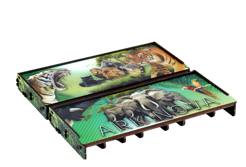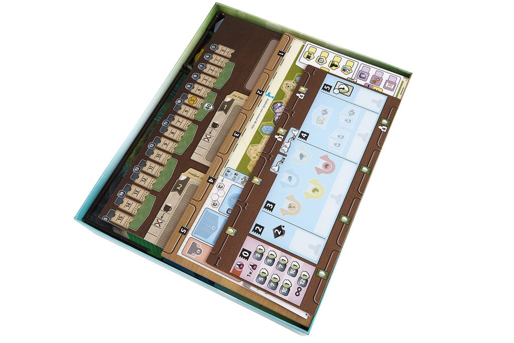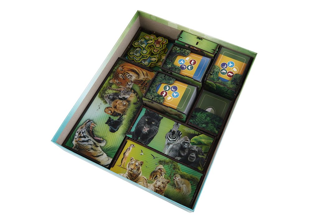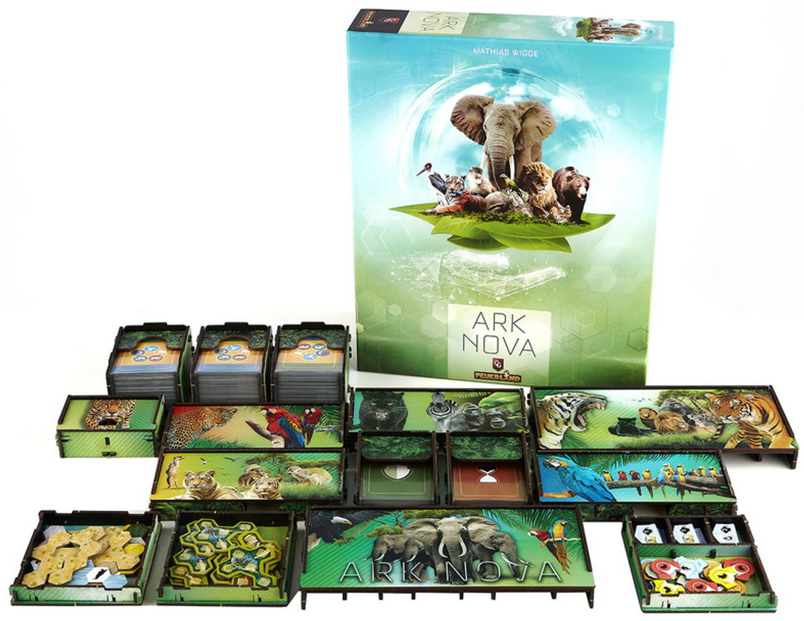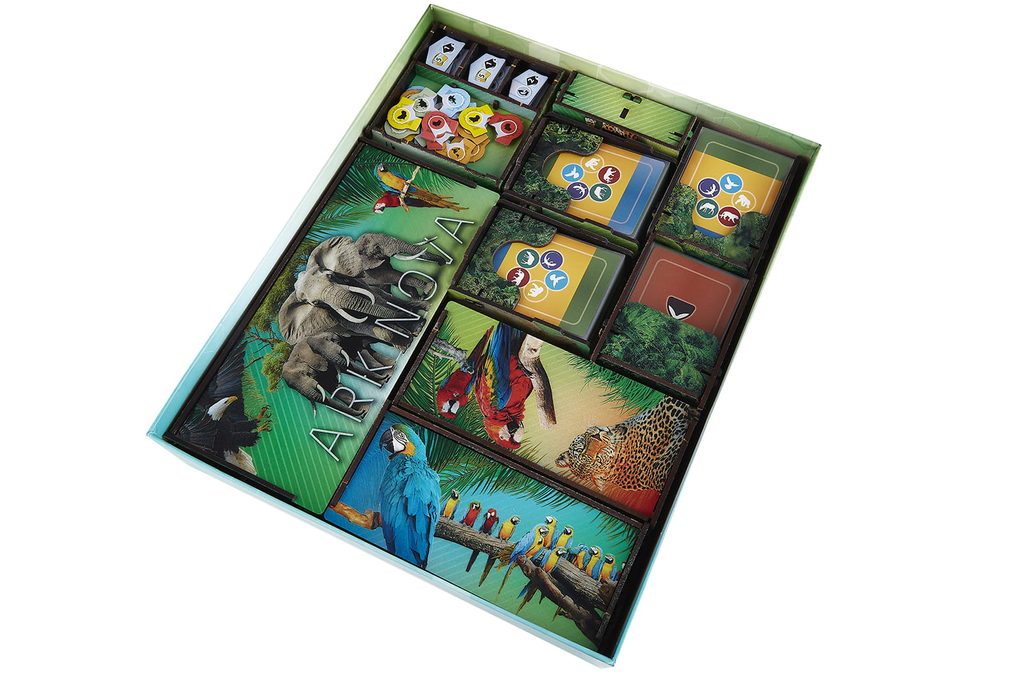 Barevný Insert od firmy e-Raptor pro hru Ark Nova (Archa Nova). Všechny komponenty mají své místo, insert počítá s obalenými kartami.