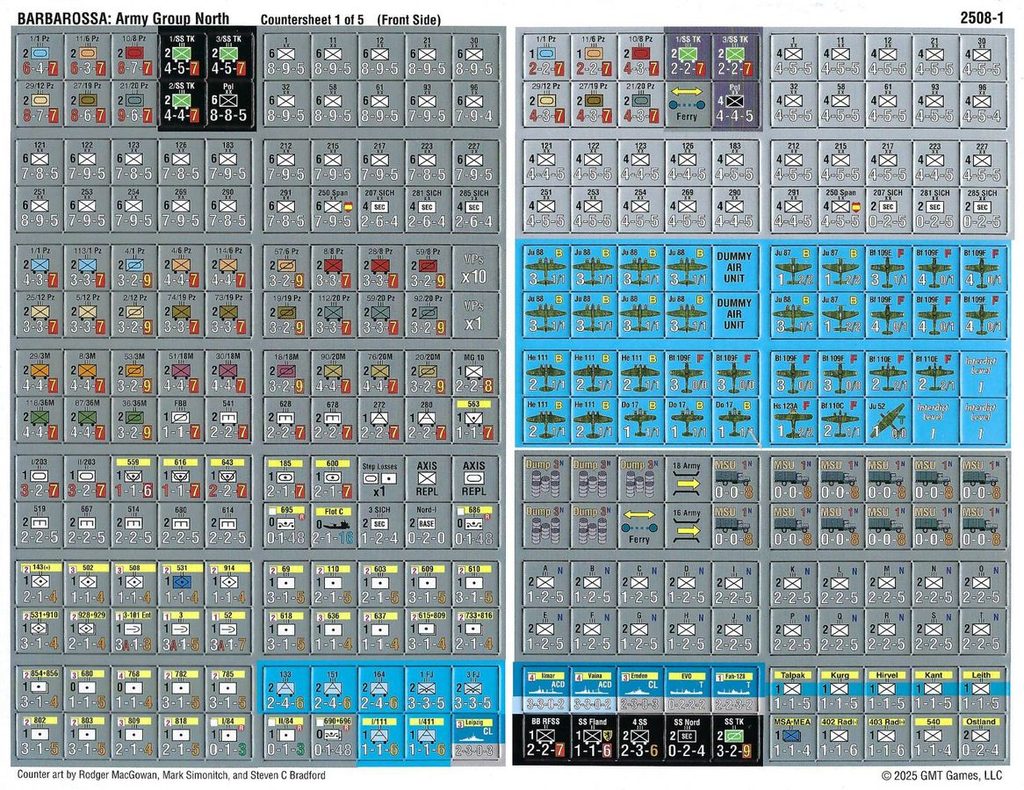 - 1 oboustranný skládací list (28 x 43cm) s podmínkami vítězství pro jednotlivé scénáře a informacím o zálohách, palivu, zásobování útoku či přestavbě železničních kolejnic