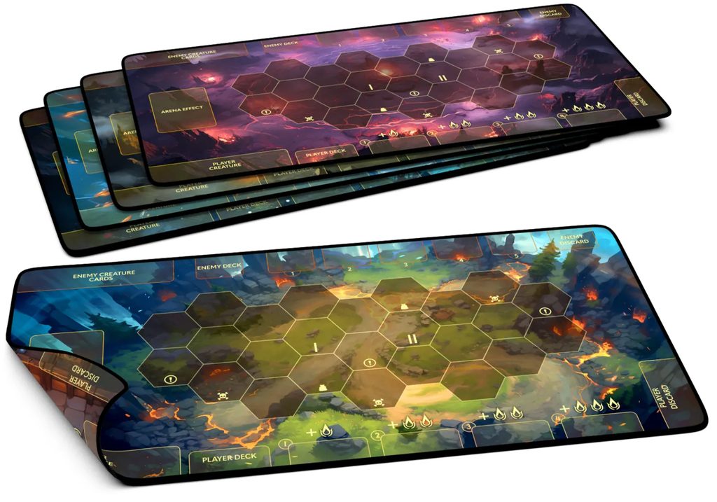 Sada pěti vysoce kvalitních oboustranných neoprenových herních podložek pro kooperativní kampaňovou hru Dragon Eclipse. Každá z podložek obsahuje odlišné arény.