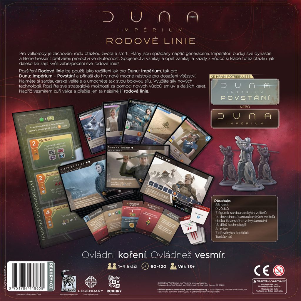 Rodové linie jsou rozšíření jak pro původní hru Duna: Impérium, tak pro novější variantu Duna: Impérium - Povstání. Přináší nové vůdce, celý nový modul technologií, kontrakty, intriky či další karty. A nebo také sardaukarské velitele, které můžete získat a kteří vám v boji mohou pomoci svými silnými schopnostmi.