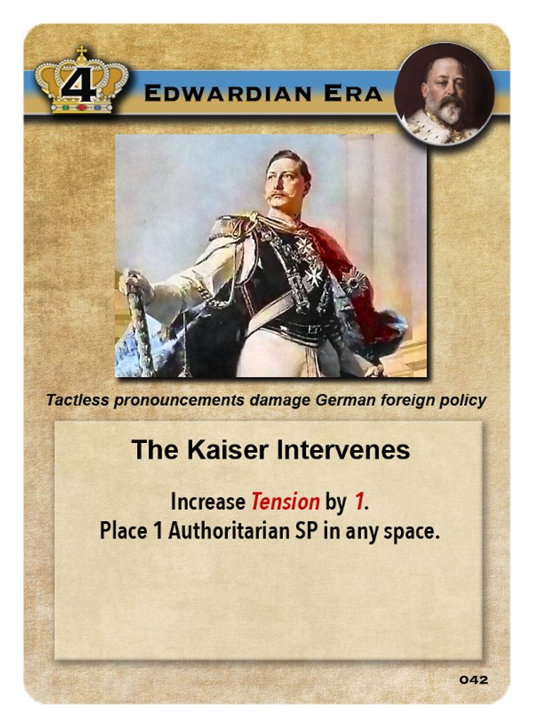 Mnoho obsažených událostí vychází z (historických) krizí, které mohly tehdy zahájit Světovou válku. Spuštění každé takové události zvýší pnutí mezi evropskými národy, takže bude třeba hodit kostkou na krizi. Výsledek tohoto hodu pak modifikuje aktuální míra napětí a počet spojenectví, které již uzavřely evropské velmoci. Nakonec, v případě, že hráči neuhlídají míru pnutí, může tento hod zažehnout Velkou válku a ukončit tak hru tím, že se určí výsledek konfliktu a provedě závěrečné bodování.