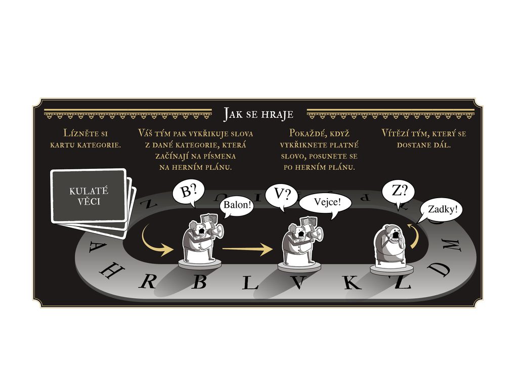 Váš tým bude vykřikovat slova, která začínají na konkrétní písmeno a zapadají do určité kategorie. Počáteční písmena se změní pokaždé, když zakřičíte správnou odpověď, a pokud váš tým vymyslí víc slov než ten druhý, získáte body.