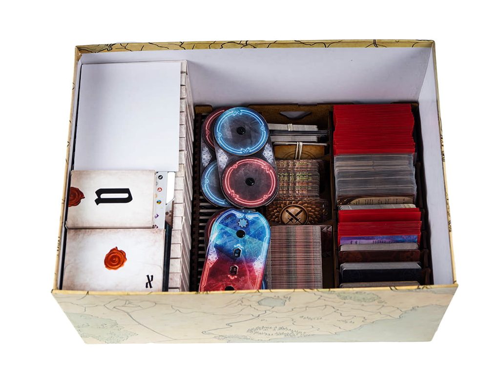 Insert od firmy e-Raptor pro hru Gloomhaven (Gloomhaven CZ) a rozšíření Forgotten Circles (Zapomenuté kruhy). Všechny komponenty mají své místo, insert počítá s obalenými kartami.