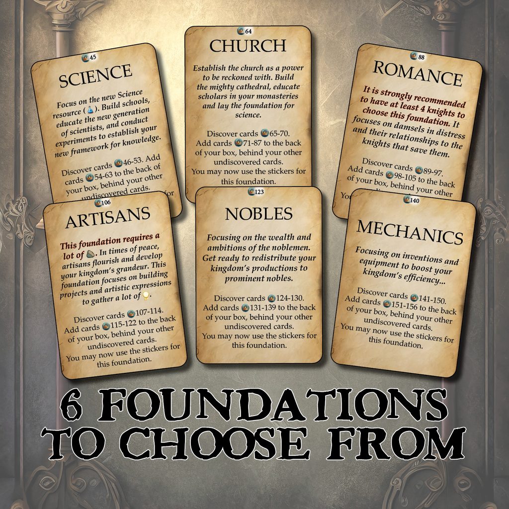 Balení Foundations obsahuje 3 rozšíření ke hře Kingdom Legacy: Feudal Kingdom (vyšlo česky jako Králův odkaz) - The Black Plague, Invasion a Nature's Revenge.