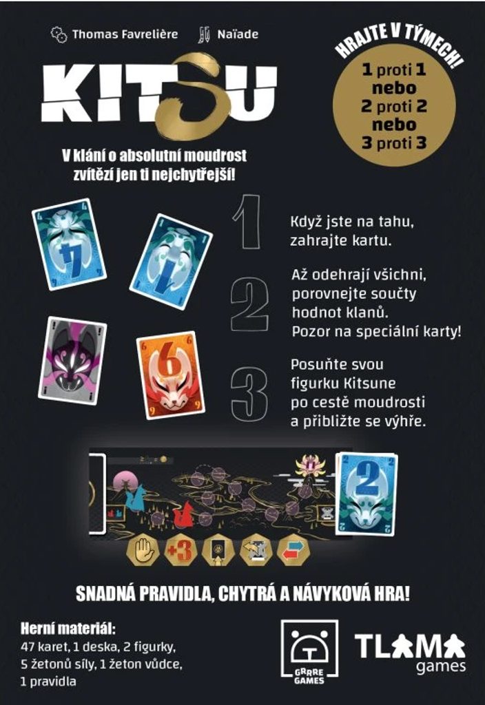 Kitsu je štychová hra, v níž jde o klání o absolutní moudrost. Hrát můžete sami nebo v týmu. Využijte sílu karet tak, aby vaše kitsune (japonsky liška) postoupila na stupnici moudrosti.