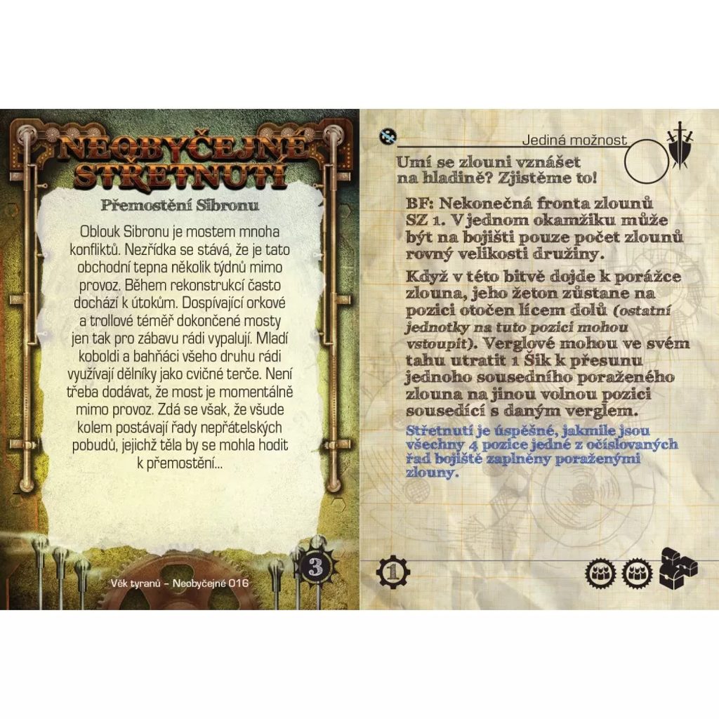 Rozšíření Věk tyranů přináší 21 nových střetnutí pro první 3 dny (7 pro každý den), což přidá osvěžující variabilitu do začátku hry. A to i v případě, že hrajete standardní hru s jedním tyranem. Pokud zkombinujete střetnutí z rozšíření Věk tyranů a 40 dní v Dálorii, bude každé vaše dobrodružství velice nepředvídatelné.
