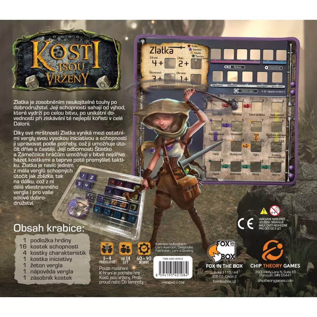 Zlatka přichází s vlastní sadou 21 unikátních kostek, vyváženým žetonem vergla, uzavíratelným pořadačem na kostky a neoprenovou podložkou vergla s prošívanými okraji.