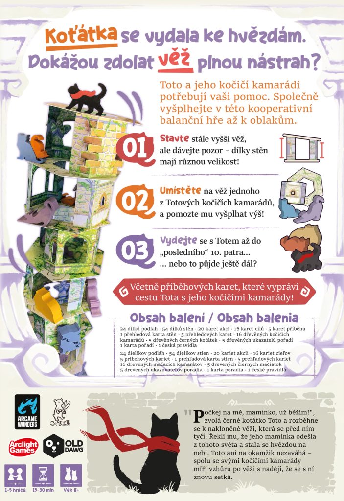 Pomozte Totovi vzhůru ke hvězdám. Věž si ale musíte postavit sami – z nestejně vysokých zdí a s kočičími přáteli, kteří se neustále pohybují. Někdy vám pomůžou vyrovnat vratkou stavbu, jindy vám ale zkomplikují přidávání nových pater. Každé kolo se rozhodujete, zda budete stavět věž dál, nebo podstoupíte dovednostní výzvu, která ukáže, jak pevnou máte ruku.