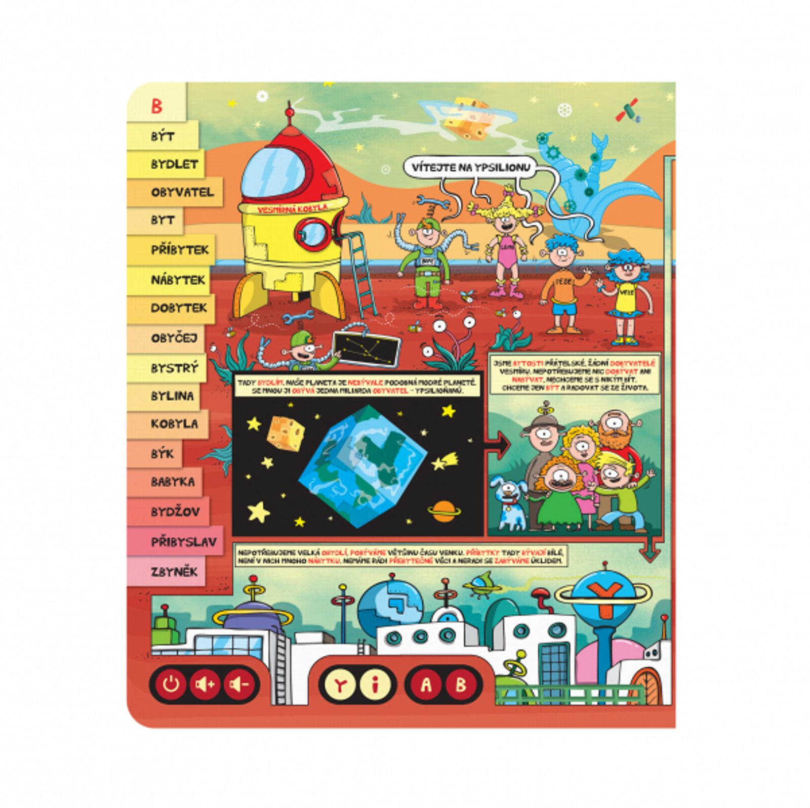 Interaktivní mluvící kniha Vyjmenovaná slova z edice Kouzelné čtení od Albi naučí děti vyjmenovaným slovům. Mimozemšťánci Befe, Leme, Pese a Veze vezmou děti na svou planetu Ypsilion, kde je zábavnou formou naučí vyjmenovaná slova. Napínavá dobrodružství jsou obohacena úkoly k procvičení znalostí psaní I a Y.