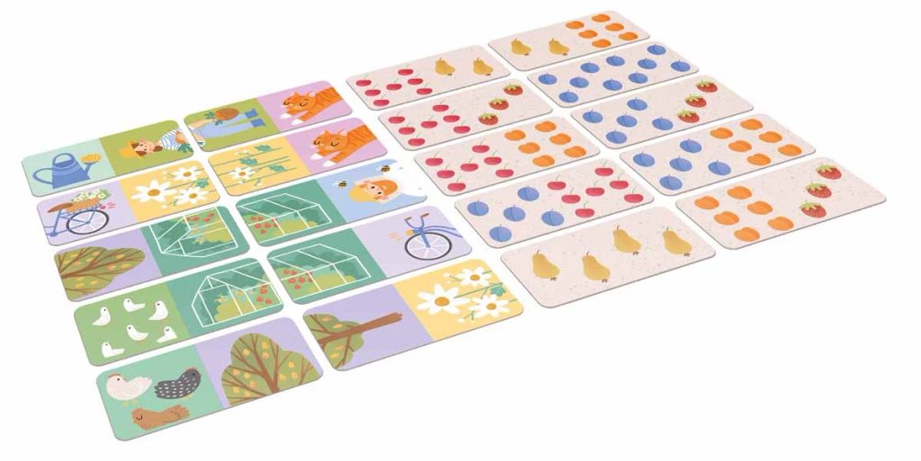 Na zahradě je spousta věcí, které mohou děti objevovat. Zábavné skládání kartiček Domina ze série Kukikuk trénuje jemnou motoriku i logické myšlení batolat. Sada obsahuje 28 velkých pevných dílků o velikosti 12 x 6 cm.