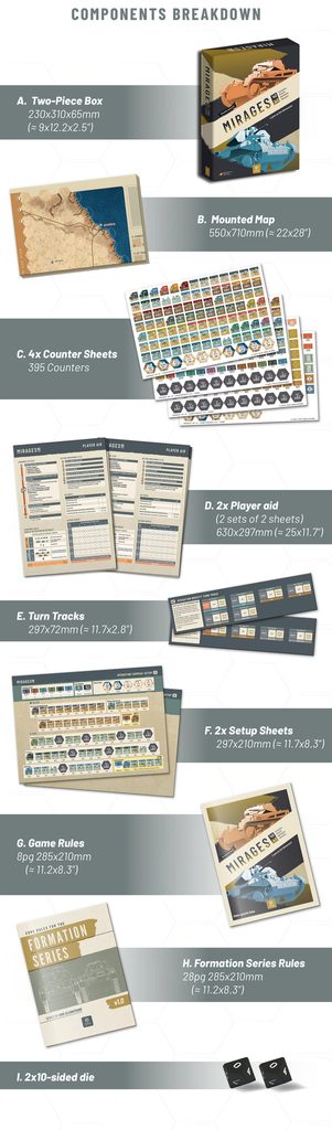 Vstupte do nevlídných pouští druhoválečné Severní Afriky se hrou Mirages. Ta je vtahující, operační válečnou deskovkou, která se zaobírá důležitými bitvami na daném území mezi prosincem 1940 a červnem 1941. Pojímá tak vojenské operace Compass, Brevity, Battleaxe a Skorpion.