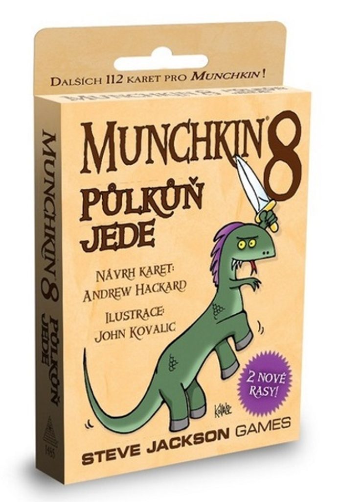 Tyto dva klasické fantasy národy dostanou v tomto rozšíření Půlkůň jede pro hru Munchkin pořádně do těla. K tomu zde ještě naleznete novou rasu i úrovně - nyní můžete získat tituly Eliťák, Legendání nebo Stařešina. Nebojte se získat všechny tři. Až budete bojovat proti stvůrám jako Televiznímu gekonovi, strašlivánské Kentaurnožce či děsivé Rytířově kobyle, rozhodně je oceníte. Rozšíření obsahuje obvyklých 112 nových karet. Jméno pro toto rozšíření bylo vybráno v soutěži, kde účastníci posílali své návrhy a tajemná hůlka tvůrce hry, Steva Jacksona z nich vybrala termín "Půlkůň jede".