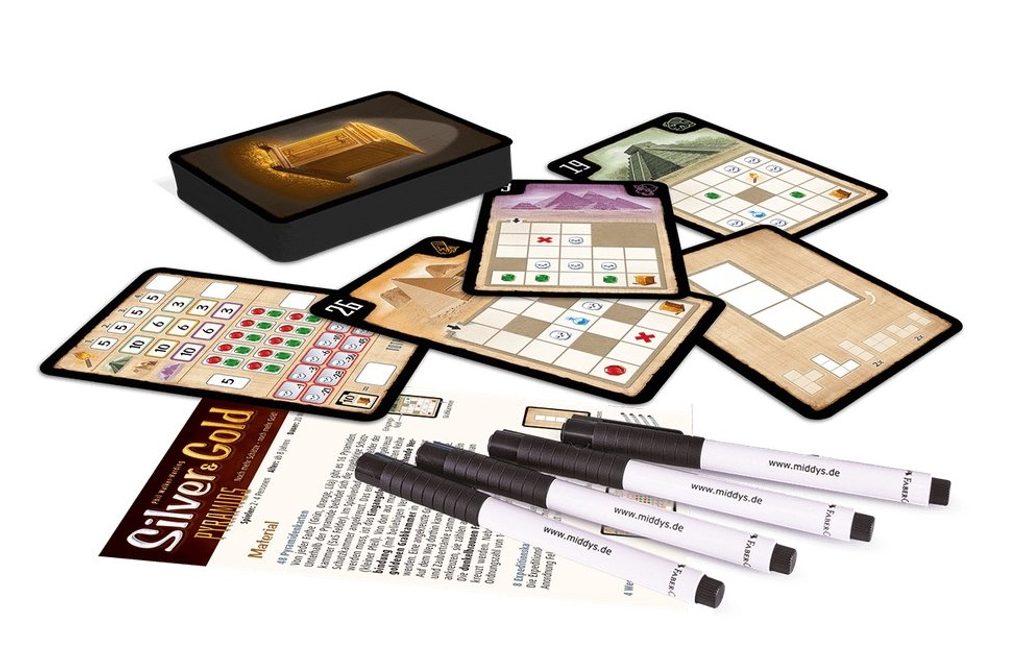 Rodinná hra Silver & Gold Pyramidy vás zavede na hravou expedici do světa pyramid. S pomocí jednoduchého mechanismu tahání karet a zakreslování tvarů budete prozkoumat pyramidy, sbírat drahokamy a snažit se dosáhnout pohřební komory na konci map(y) s nejcennějším lupem.