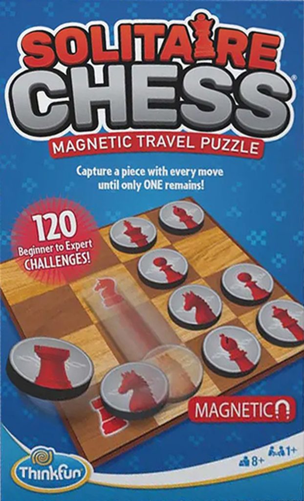 Magnetická cestovní hra Solitérní šachy kombinuje klasická šachová pravidla s jednoduchým úkolem: při každém tahu, který uděláte, MUSÍTE sebrat jinou figuru. Hra přináší 120 zadání pro jednoho hráče od úrovně začátečníka až po úroveň experta – obtížnost roste s tím, jak se vyvíjejí vaše schopnosti.