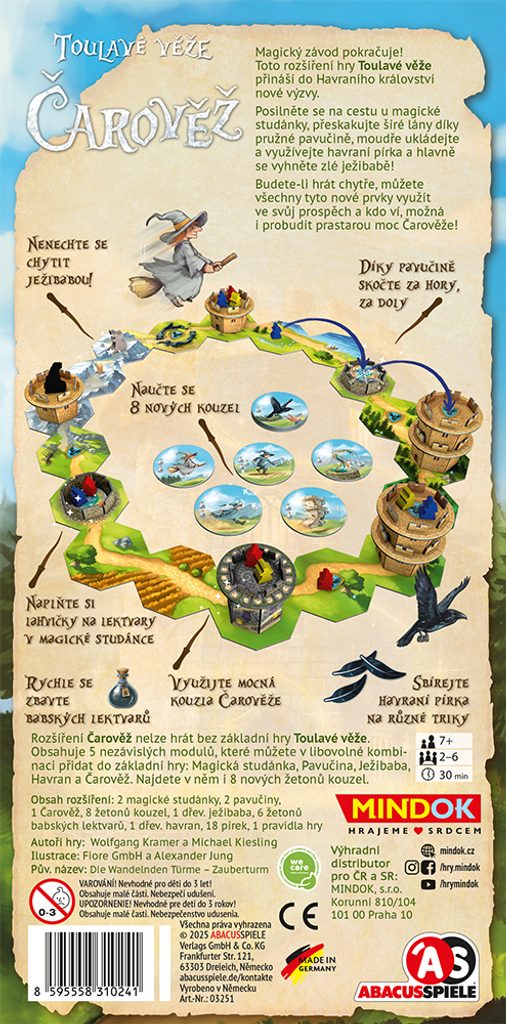 Ústředním prvkem je samotná Čarověž, která se po hracím plánu pohybuje jako ostatní věže, ale nabízí mocný bonus. Pokud na jejím cimbuří zakončí pohyb váš čaroděj, můžete okamžitě seslat libovolné kouzlo zcela zdarma, aniž byste museli platit naplněnými lektvary. Navíc do hry přibývá sada nových kouzel, která vám umožní taktizovat s pohybem figurek i věží efektivněji než kdy dříve.