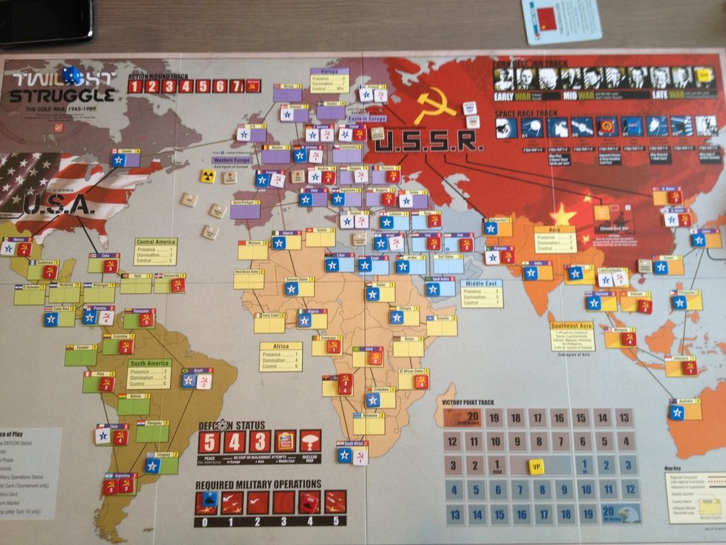 Hra Twilight Struggle se hraje v průběhu tří období, ve kterých je obsaženo 10 kol. Každé období má svůj vlastní balíček karet, pomocí kterých prakticky ovládáte celou hru. Na začátku hry si v určených státech vybudujete určitý vliv. Každý stát má svou míru politické stability i určitou pozici v politickém spektru svého světadílu. Politická stabilita určuje, kolik vašich bodů vlivu je třeba naládovat do dané země, aby se dostala pod vaše područí. Ovládat co nejvíce zemí je ve hře klíčové, protože právě z nich se vám průběžně přičítají body. Každá karta událostí má svou speciální schopnost, náleží určité straně a má svou operační hodnotu. Hráči každé kolo hrají se sedmi novými kartami na ruce a je na nich, jak je využijí. Operační hodnota se dá využít k získávání vlivu, organizování převratů, snižování vlivu oponenta v cizích zemích či postup v kosmickém závodu. Speciální schopnosti jsou zase naprosto unikátní a je dobré si je často šetřit do budoucna. Navíc u většiny karet zahrání jejich schopnosti znamená definitivní odhození karty ze hry. Po celou dobu hry se snažíte aby ukazatel nukleární pohotovosti nebyl snížen na bod 1, který znamená nukleární válku. Jakmile totiž vypukne, hra končí a hráč, který ji má na svědomí, prohrává hru. Stupeň nukleární pohotovosti se zvyšuje pořádáním převratů a některými událostmi. Hráči nemají žádnou bodovou trať, po které nezávisle na sobě postupují, ale bodovou linii sdílejí, takže to skutečně v průběhu hry vypadá jak přetahování na pískovišti, což tenkrát také bylo. Vyhrává ten, který: