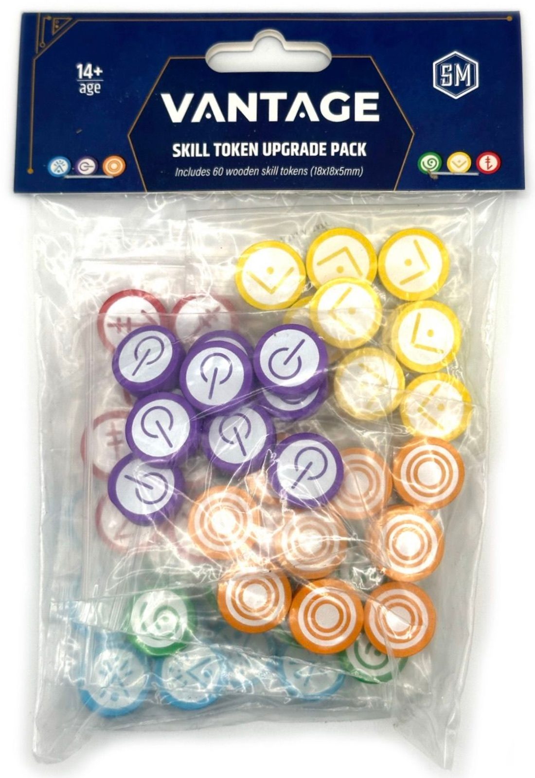Balení 60 dřevěných žetonů schopností navržených speciální pro hru Vantage. V té jsou mimo nich jinak žetony kartonové.