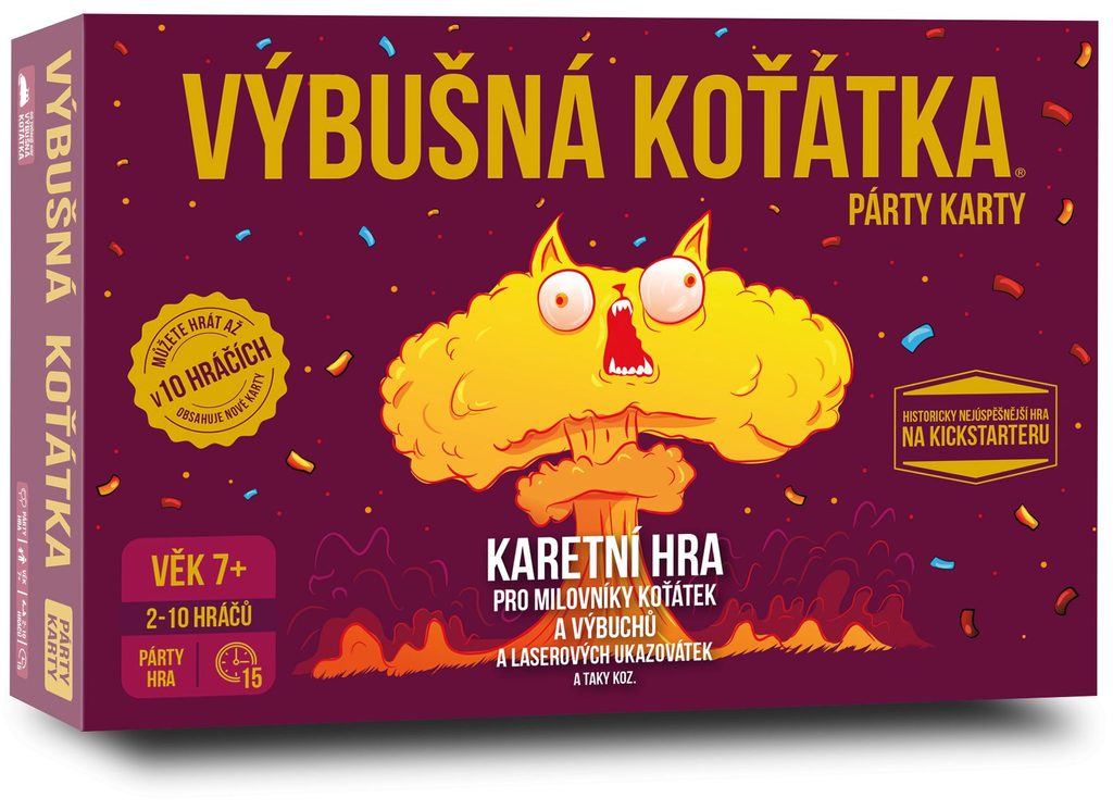 Výbušná koťátka: Párty karty je dalším příspěvkem do rodiny kočičí verze ruské rulety. Krabička nejen, že po otevření hraje (hudba vážně sedne), ale ukrývá karty až pro deset hráčů.