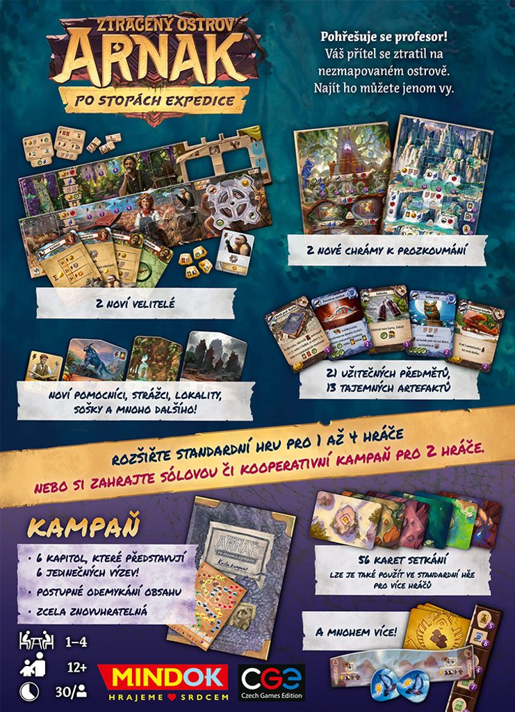 Po stopách expedice je druhé rozšíření pro vážně skvělou hru Ztracený ostrov Arnak. Díky dvěma novým vůdcům (novinář a mechanička) můžete vyzkoušet nové strategie, na dvou nových stupnicích bádání posunout své vědění o kus dál, vystavět expediční tým s novými artefakty, předměty a asistenty.